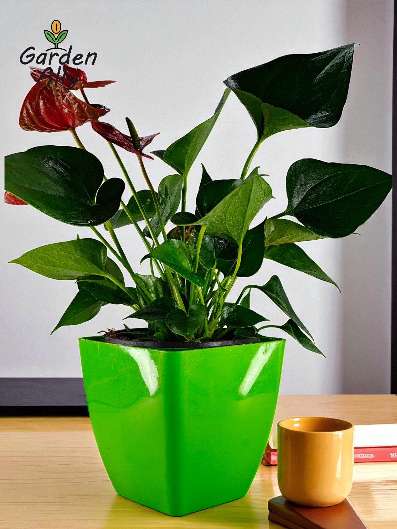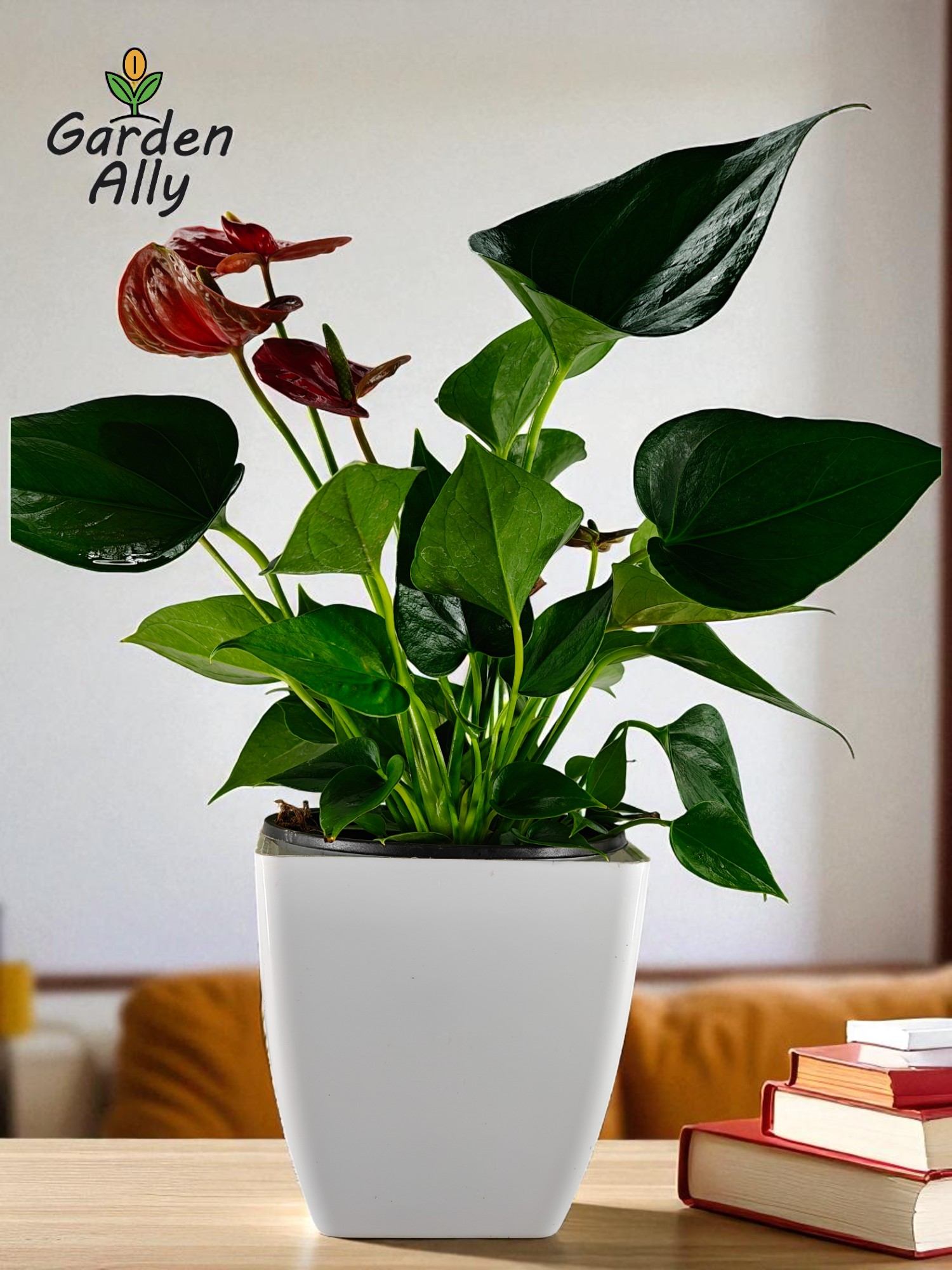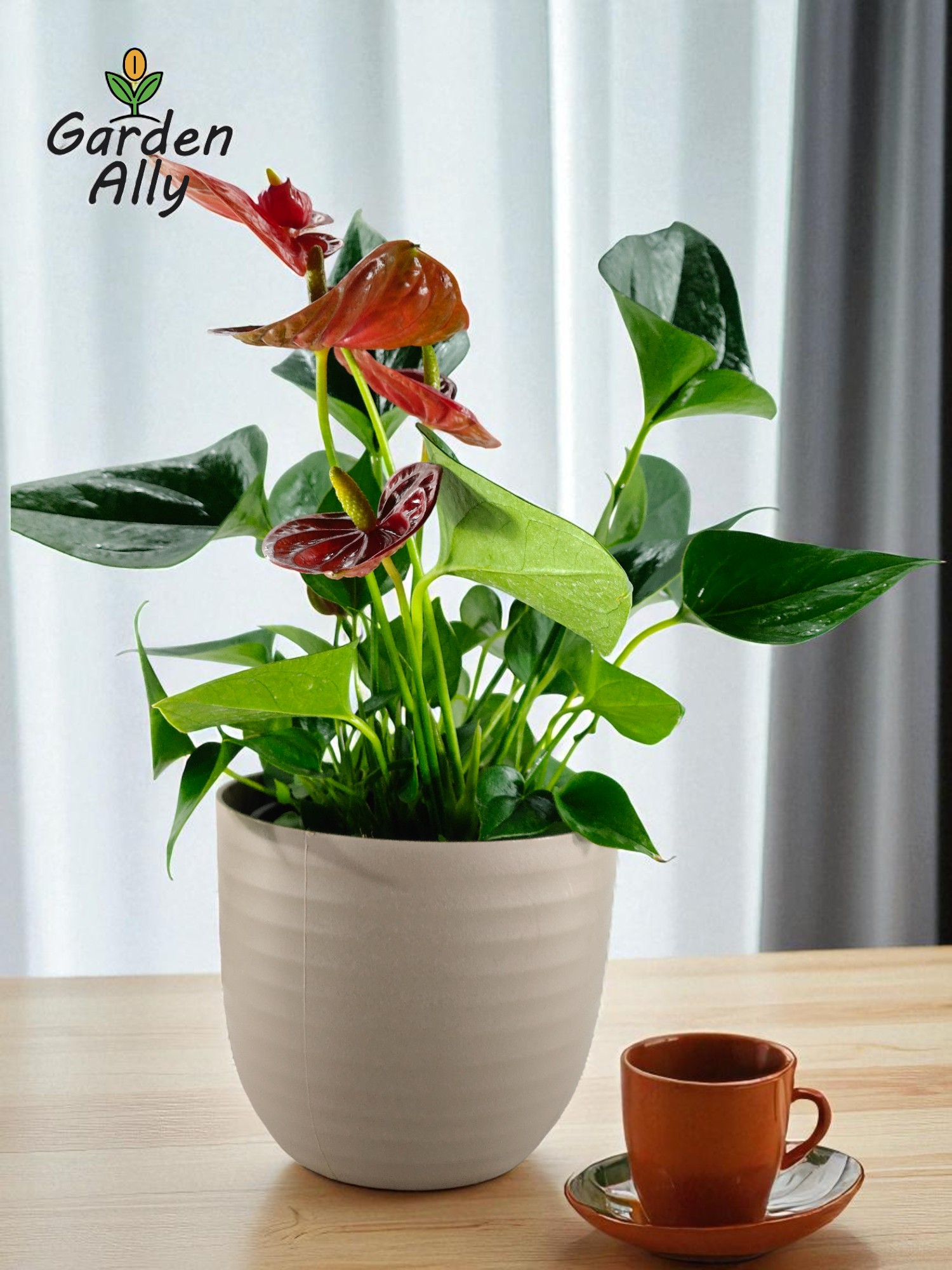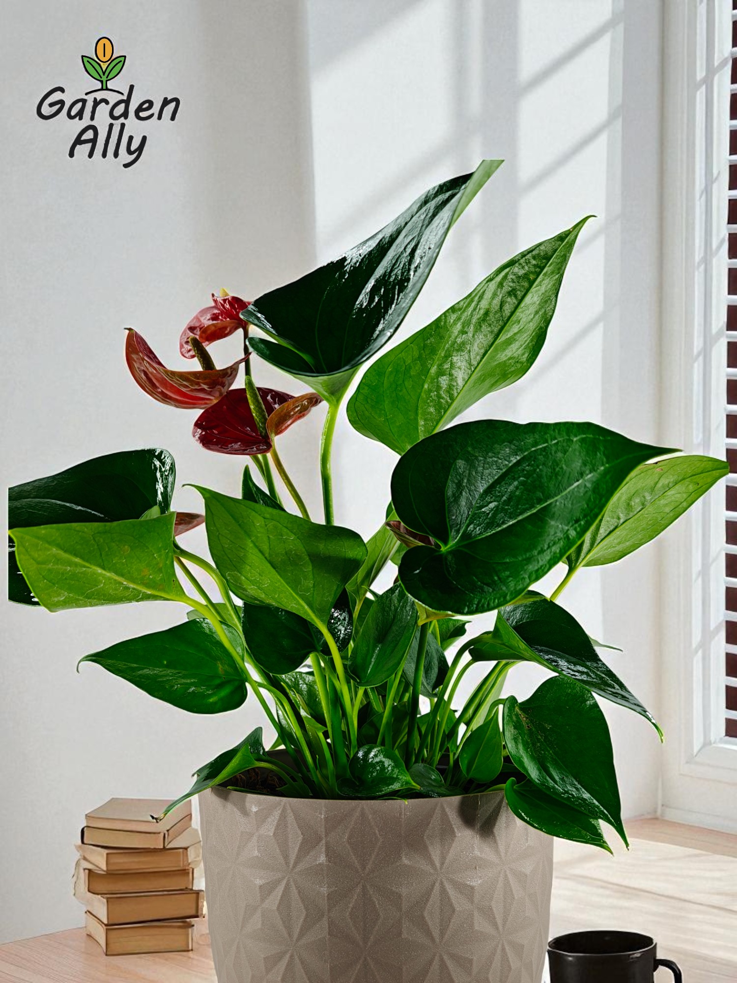 They typically have glossy, heart-shaped red spathes with a prominent central spike (spadix) which holds the true, tiny flowers.